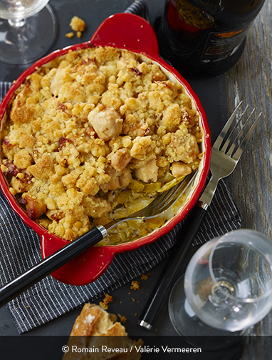 Parce qu’il n’y a pas que le fondant au chocolat et son coulis de fruits rouges pour faire craquer sa moitié ! Le poulet sait aussi se faire craquant avec sa robe en crumble et fondant avec ses poireaux et oignons…