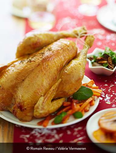 Après la cuisson du chapon, laissez reposer la viande 15 minutes au moins avant de la découper, temps qui vous permettra de faire réduire le jus de cuisson, débarrassé de la graisse en surface, afin de le concentrer et de le parfumer avec des zestes de citron vert, jaune et clémentine (blanchies 3 fois, départ à froid, au préalable.)