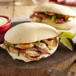 Répartissez les lanières de poulet sur les tartines tartinées de moutarde.