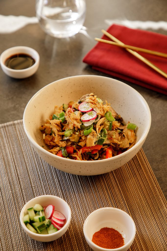 Faites chauffer un peu d’huile dans une poêle, ajoutez l’effiloché de poulet et le riz et les faire cuire quelques minutes afin qu’ils soient croustillants